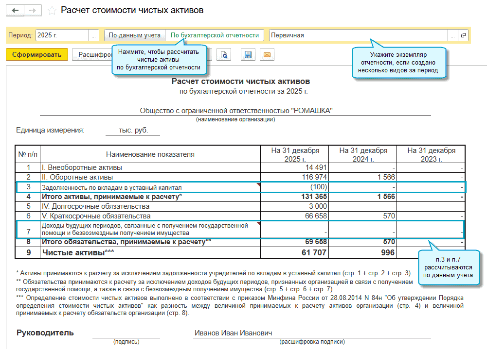 В программе «1С:Бухгалтерия 8» начиная с релиза 3.0.191.3 добавлена возможность рассчитать стоимость чистых активов в соответствии с приказом Минфина России от 28.08.2014 № 84н в редакции от 31.03.2025.