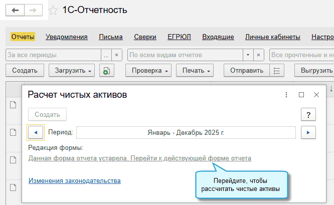 Полный интерфейс: меню «Отчеты - 1С-Отчетность - Регламентированные отчеты - Отчеты - Бухгалтерская отчетность - Расчет чистых активов».